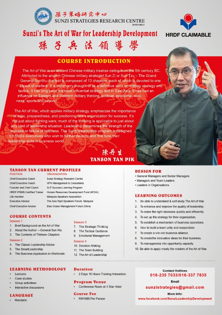 ☆《孙子兵法领导学》是于四星级酒店会议厅举行,包含16小时专业课程,印刷精美的讲义,两天简式早餐、国际自助午餐、二个茶点,以及印刷精緻的结业证书。